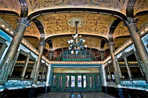 Between the box office and the entrance to the Palace Theatre is a spacious exterior lobby area with marble floors, lights and display cases for show posters. Above the entrance doors are windows to the women's lounge on the second floor, so that the women in the lounge upstairs could spot the men waiting for them in the exterior lobby below. The smaller interior lobby is a new addition to the Palace Theatre, separating the entry area from the entrance to the auditorium.View Photos -